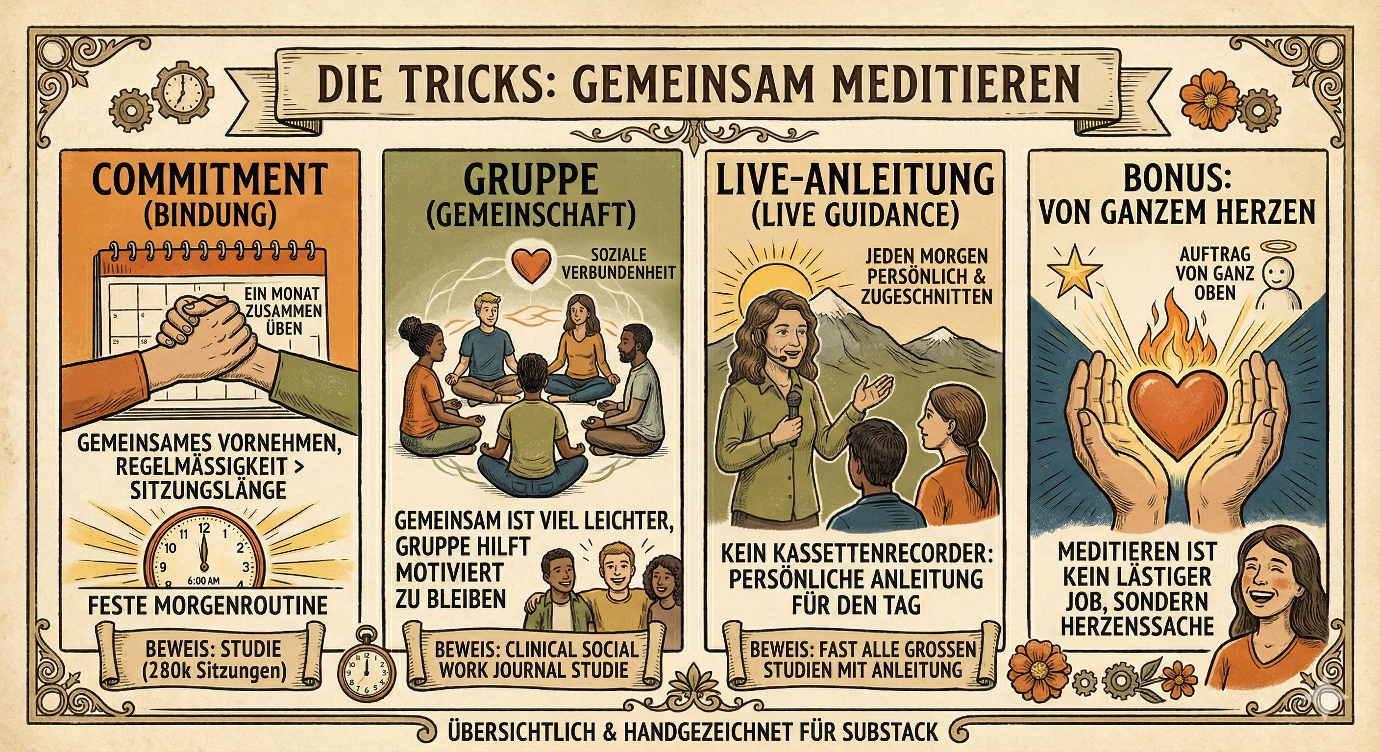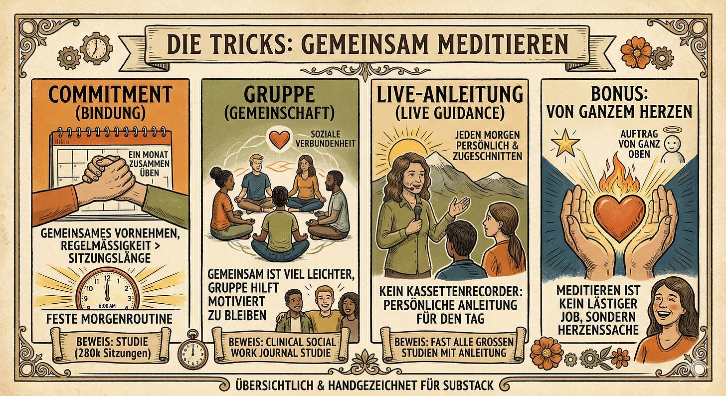 Commitment — wir nehmen uns gemeinsam vor, mindestens einen Monat zusammen zu üben. Wir lassen uns darauf ein und bleiben dabei. (Eine Studie mit 280.000 Meditationssitzungen hat gezeigt: Regelmäßigkeit ist wichtiger als Sitzungslänge. Wer sich eine feste Routine baut — am besten morgens — bleibt deutlich häufiger dabei.)