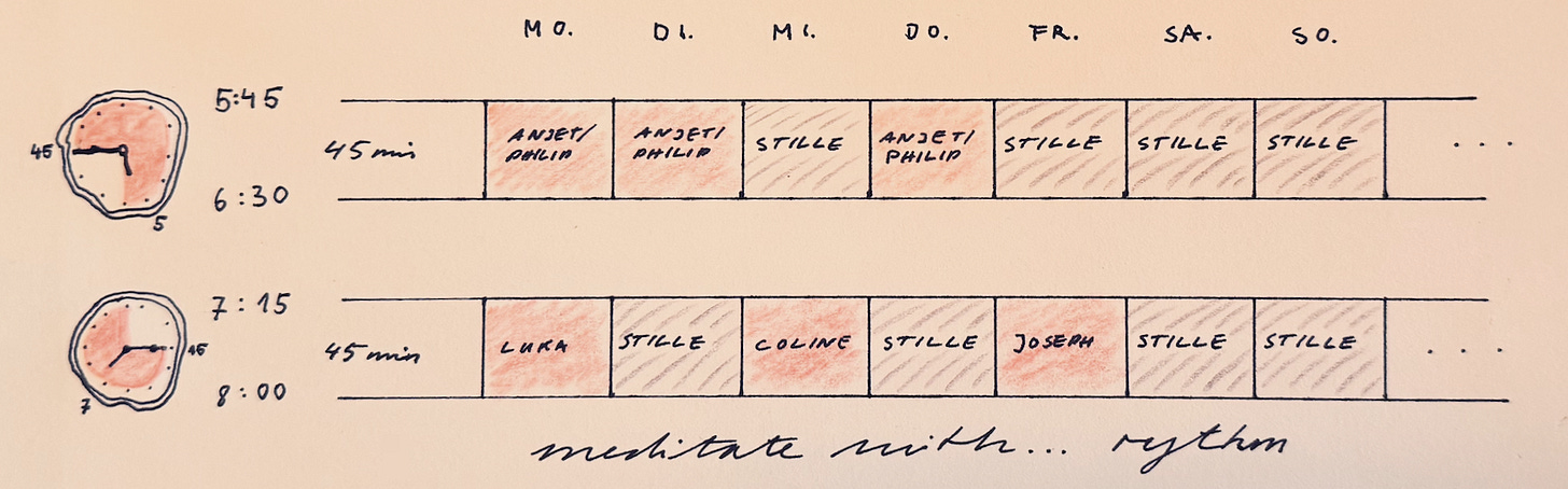 Was auch gleich bleibt: Wir meditieren jeden Tag für einen Monat (fast), in der Gruppe, mit Anleitung, am Wochenende in Stille.