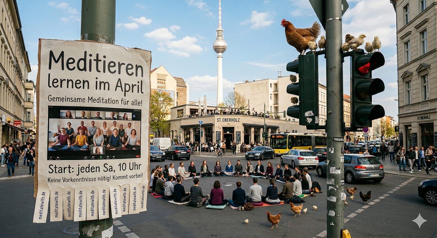 COMMUNITY CALL: 10. April, 20:00–21:30 Uhr (für Austausch in Triaden und Fragen zur Meditation — ist immer sehr schön)
