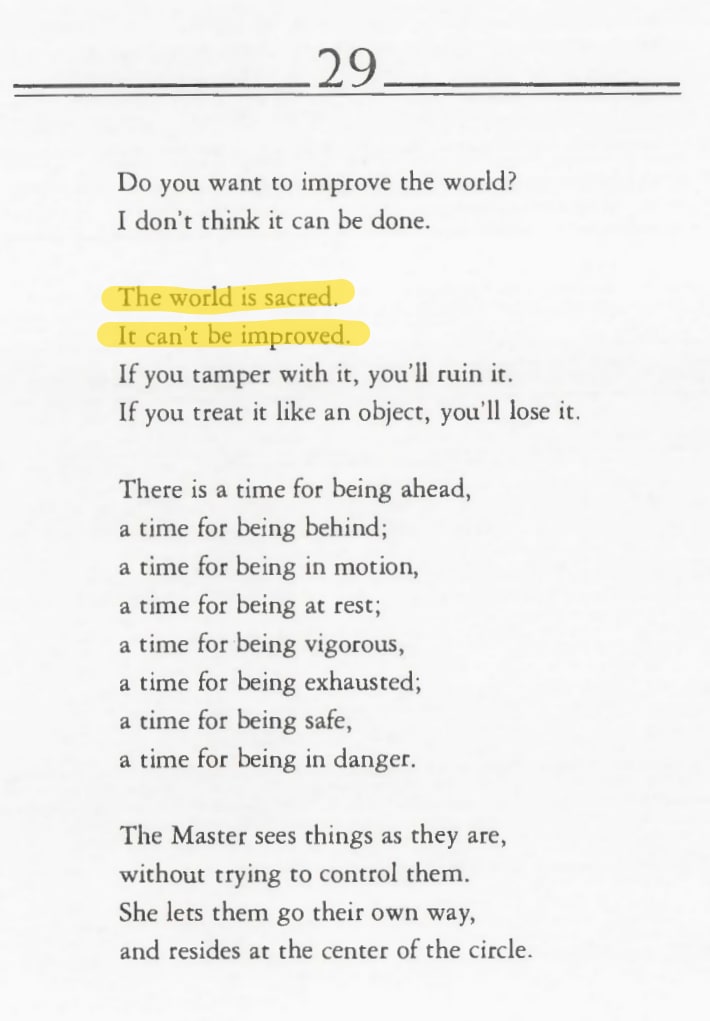 Im Tao gibt es einen Ausspruch: “The world is sacred, it can’t be improved, if you tamper with it, you’ll ruin it” — das habe ich heute besser verstanden, im Unvollständigen liegt das, was verborgen ist, wir dürfen es entdecken, wenn wir es überschreiben, wenn wir denken, wir wissen, wie es geht, dann ruinieren wir es.